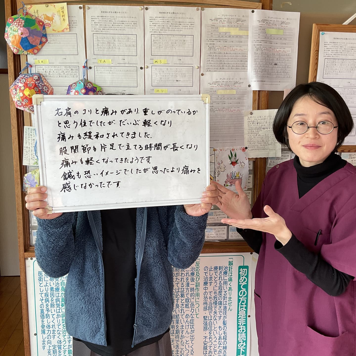 右肩のコリと痛みがあり、重しがのっているかと思うくらいでしたが、だいぶ軽くなり痛みも緩和されてきました。股関節も片足で立てる時間が長くなり痛みも軽くなってきたようです。鍼も怖いイメージでしたが、思ったより痛みを感じなかったです。