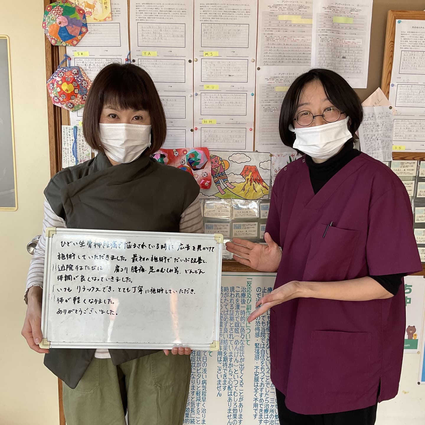 ひどい坐骨神経痛で悩まされている時に広告を見かけて施術していただきました。最初の施術でだいぶ改善し、通院するたびに肩こり、腰痛、足のむくみ等、どんどん体調が良くなっていきました。いつもリラックスでき、とても丁寧に施術していただき、体が軽くなりました。ありがとうございました。